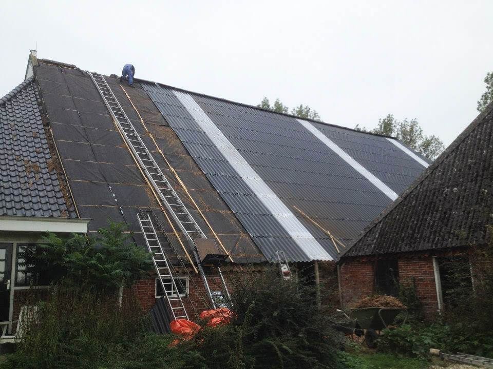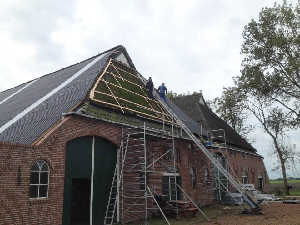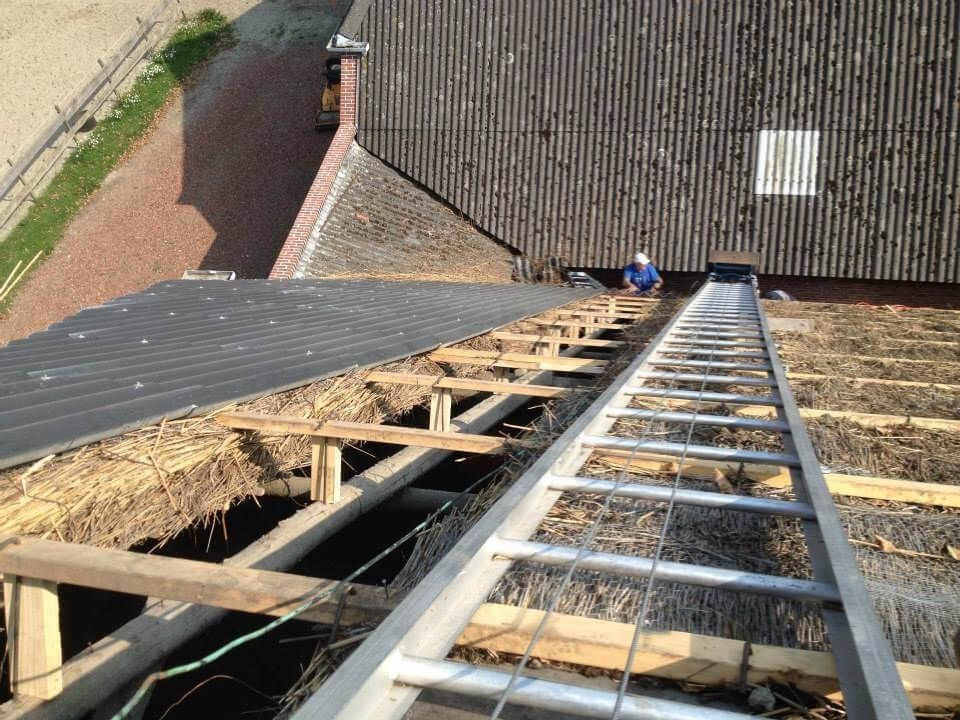 In Kantens hebben we de originele rieten kap voorzien van golfplaten. In eerste instantie is er houtwerk bevestigd over het originele rieten dak. Vervolgens zijn er lichtbanen gemaakt in de rieten kap van +/- 15 meter hoog. Het rieten dak onder de nieuwe golfplaten is voorzien van een dampdoorlatende folie, om vochtproblemen te voorkomen. Vervolgens zijn de golfplaten aangebracht en is het resultaat werkelijk schitterend geworden. De lichtstraten geven ruim voldoende licht in de schuren.